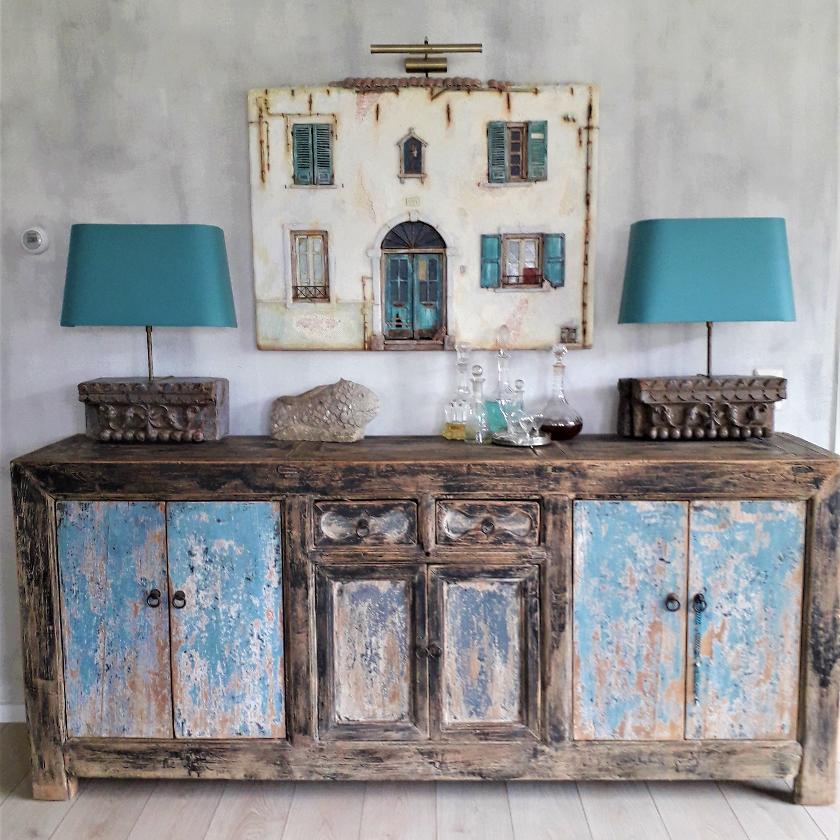 Een eclectisch interieur.Dressoir en lampen via Alex Janmaat Kunst en antiek, Oudewater.